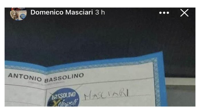 Domenico Masciari, candidato nella lista Bassolino per Napoli, ha postato in una storia sulla sua pagina Facebook una foto scattata in cabina elettorale con la preferenza Masciari. La notizia è stata riportata dall'agenzia LaPresse. Anche la moglie, Alessandra Parlato, conosciuta per essere tra le protagoniste della trasmissione tv "The Real Housewives Napoli", ha postato alcune storie su Instagram: «Potete mandare anche uno scatto, a buon intenditor poche parole» dice la moglie di Masciari, che ha poi ripostato la storia. «Buongiorno sono davanti all'Umberto per chi non avesse seguito la diretta - dice la moglie di Masciari -, ho appena votato e lo dico con tutta onestà e franchezza come ha già fatto qualche nostra vera amica, potete mandare anche uno scatto. A buon intenditor poche parole». E incalza: «Per gli indecisi almeno affidatevi a chi di politica davvero ne sa qualcosa, ha una storia famigliare».