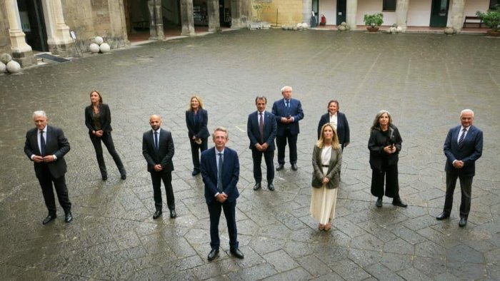 La giunta e' stata presentata alla stampa nella Sala dei Baroni. Sei uomini, cinque donne. Il sindaco pero' ha deciso di riservarsi dieci deleghe: cultura; Pnrr, finanziamenti europei e territoriale; grandi progetti, personale, organizzazione; decentramento; digitalizzazione e innovazione. Il coordinamento di queste deleghe e' affidato al professore Sergio Locoratolo, gia' coordinatore del programma elettorale. Manfredi ha confessato di aver voluto tenere la cultura perche' se avesse fatto l'assessore avrebbe voluto quella delega. Una confessione che ha strappato un lungo applauso.
