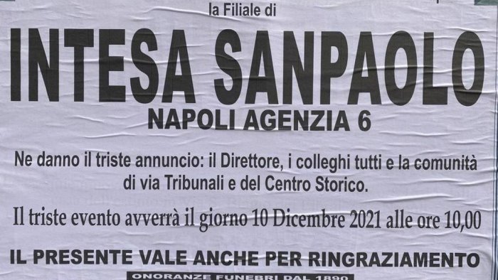 A Napoli è spuntato un manifesto funebre singolare che ha coperto i muri del centro storico. Si tratta di un messaggio di ‘lutto’ per il gruppo bancario Sanpaolo-Intesa. “Stanno chiudendo tantissime filiali di quello che un tempo fu il Banco di Napoli, oramai quasi totalmente smantellato e privato anche del nome. Ci hanno segnalato nell'ultimo mese oltre 20 chiusure tra filiali e sportelli bancomat nella sola città di Napoli di quella che un tempo era la banca del sud. E’ questo il risultato di una gestione passata scellerata e di un mondo che va sempre più veloce e di una società che chiede sempre di più, grazie anche alla digitalizzazione, in molti casi arrivata all’estremo. Occorre riflettere e fare il punto di una situazione che anche a causa della crisi covid diventa sempre più complicata. ”- ha dichiarato il Consigliere Regionale di Europa Verde Francesco Emilio Borrelli.