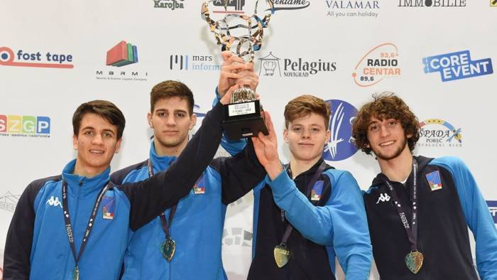 Luccicano d’oro le spade under17 della Campania. Nella quarta giornata degli Europei Cadetti e Giovani 2020, in corso a Parenzo, l’Italia ha conquistato il titolo continentale con la squadra di spada maschile. La formazione italiana Cadetti, per metà campana perché composta, con il torinese Simone Mencarelli e il ferrarese Federico Pezzoli, da Fabrizio Cuomo del Club Schermistico Partenopeo e da Davide Santoro del Club Scherma San Nicola, porta a casa la medaglia d’oro grazie alla stoccata del 45-44 in finale sulla Russia.