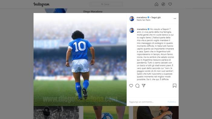 Gli hashtag #andràtuttobene, #distintimauniti e #iorestoacasa: anche Diego Armando Maradona rinnova l'iniziativa social e augura il meglio all'Italia e alla sua Napoli nella fase critica dell'emergenza coronavirus. Messaggio con un post sulla pagina ufficiale Facebook: "Ho vissuto a Napoli 7 anni. - Lì vive parte della mia famiglia, molta gente che mi vuole bene e a cui io voglio bene. - si legge sul profilo del Pibe de Oro - L'Italia è parte della mia vita e perciò voglio mandare il mio messaggio di sostegno in questo momento difficile. In Italia tutti hanno capito quanto sia importante rimanere a casa".