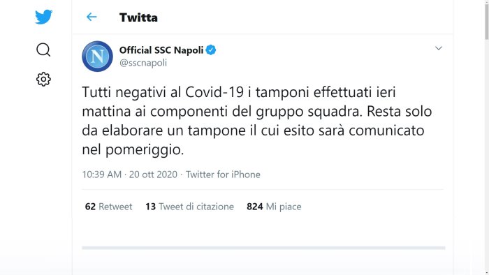 Ma dopo le polemiche in campionato per la partenza del Napoli destinazione Torino bloccata dalla ASL, i rischi del caos in ambito europeo sembrano ripresentarsi alla vigilia della partenza dell'AZ verso Capodichino. È l'assessore allo sport del comune di Napoli, Ciro Borriello, a sottolineare le preoccupazioni per il mini-focolaio della squadra di Alkmaar. Cosa può accadere nel caso di nuove certificazioni e di un scontro tra le regole d'ordinamento sportivo e quello statale e sanitario: è il rebus che può nascere e che al momento risulta escluso. Intanto, c'è la conferma - con nota twitter - della negatività al gruppo-squadra con un unico tampone da processare nel pomeriggio.