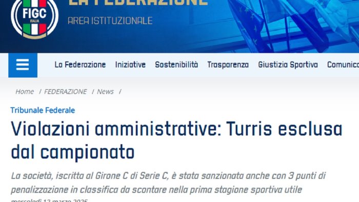 Il Tribunale Federale Nazionale ha sanzionato la Turris Calcio (Girone C di Serie C) con l’esclusione dall’attuale campionato di competenza nonché con 3 punti di penalizzazione in classifica da scontare nella prima stagione sportiva utile.