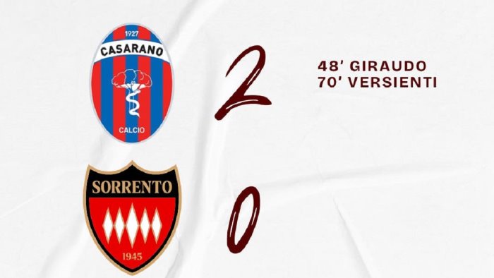 Passo indietro del Sorrento dopo la vittoria sul Catania e ko a Casarano: sconfitta maturata nella ripresa per mano di Giraudo e Versienti. Serpini ha dovuto rinunciare ai difensori Fusco e Di Somma oltre a Santini davanti e Paglino sulla corsia destra. Dentro dal primo minuto il neo acquisto Portanova. Pronti via e Leonetti si è fatto anticipare da Portanova al momento di battere a rete. Ferrara al 14' ha sfiorato il gol in percussione con il mancino, palla a lato. Sempre Ferrara ha messo in crisi la difesa ospite al 21' ma Solcia ha respinto miracolosamente. Prima vera parata di Del Sorbo al 28' su destro di Versiente. Miracolo invece del portiere del Sorrento al 36' su colpo di testa di Santarcangelo da ottima posizione.