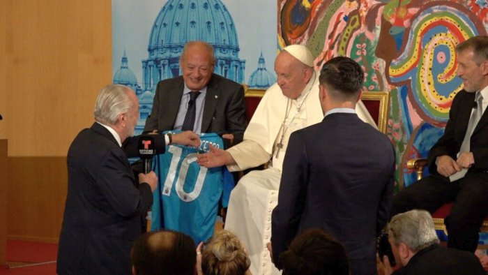 Il Presidente ha inoltre donato al Papa un piccolo calco del piede di Maradona come metafora per dare un calcio alle ingiustizie del mondo. Prima di salutare il Santo Padre, Aurelio De Laurentiis ha confidato un proprio desiderio: "Spero tanto un giorno di poter organizzare una partita tra il Napoli e il San Lorenzo la Sua squadra del cuore"
