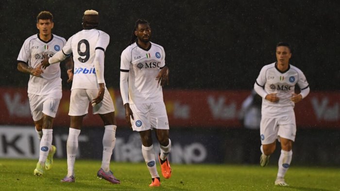Finisce in pareggio la seconda amichevole del Napoli a Dimaro Folgarida. Un test caratterizzato e condizionato da un costante acquazzone che ha accompagnato l'intera gara. Primo tempo giocato a ritmo basso, anche per i carichi di preparazione, mentre nella ripresa c'è l'atteso rientro con la maglia scudettata dei più attesi protagonisti dello scorso campionato. Si alza l'intensità di manovra e il Napoli va in bella combinazione prima con Osimhen-Kvara che colpisce la traversa, poi con un colpo delizioso di Raspadori che sfiora il gol. Segna a sorpresa la Spal con un pregevole colpo a sensazione di Puletto che trova un pallonetto da oltre 40 metri. Pareggia subito il Napoli con Anguissa lanciato da Zielinski e da una finta decisiva di Osimhen. Proprio Victor potrebbe segnare il sorpasso quasi al 90esimo ma è abile Alfonso a uscire con tempismo. Gli azzurri lasciano così il Trentino per riprendere la preparazione in Abruzzo con la prima delle amichevoli internazionali che si giocheranno a Castel di Sangro contro l'Hatayspor sabato 29 luglio allo Stadio Teofilo Patini.