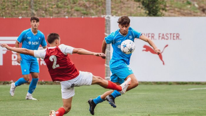 Il Napoli Primavera è stato sconfitto dal Braga per 1-0 nel match di esordio della Youth League alla "Cidade Desportiva do Sporting Clube de Braga". Portoghesi che passano dopo una decina di minuti con Noro che riprende una respinta della traversa ed infila: 1-0. Il Napoli ha una reazione di grande impeto e sfiora il pareggio al quarto d'ora con un colpo di testa di Vigliotti: si oppone il portiere lusitano che salva il risultato. Stesso copione al 28': Gioielli tira a botta sicura e ancora Carvalho si produce in una super parata. Azzurrini che meriterebbero il pareggio. Nella ripresa c'è ancora la pressione dei ragazzi di Tedesco ma il Braga resiste e sfiora il secondo gol con un numero di Goncalves e stavolta è Turi che con un intervento prodigioso chiude lo specchio. Nel finale l'assalto azzurro è massiccio ma non produce occasioni da rete. Il Napoli esce sconfitto in questo debutto internazionale ma la prestazione fa ben sperare per il prosieguo del cammino.