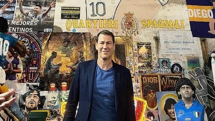 Qualcuno l’ha riconosciuto subito. Giacca e t-shirt azzurra. Una visita a sorpresa. Nel giorno del compleanno di Diego Armando Maradona, che avrebbe compiuto 63 anni, l’allenatore del Napoli Rudi Garcia ha reso omaggio al Pibe de Oro andando a scoprire lo storico murale a Largo Maradona nei Quartieri Spagnoli, luogo simbolo del campione argentino, preso d’assalto dai turisti nei giorni dello scudetto. Garcia ha voluto ammirare coi suoi occhi l’opera dell'artista Mario Filardi realizzata per lo scudetto del 1990.