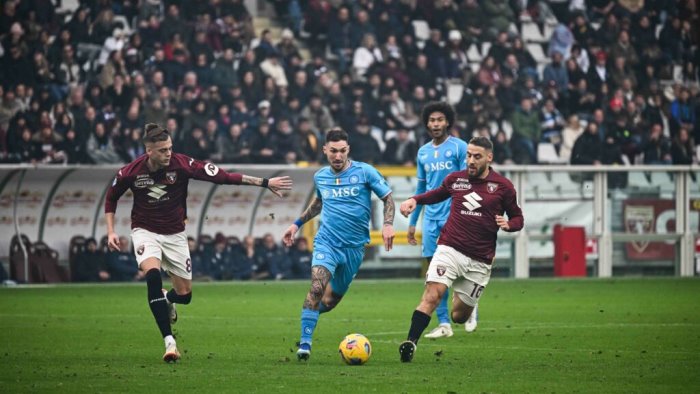 Vittoria netta del Torino, che travolge per 3-0 il Napoli di Walter Mazzarri, accorciando in classifica proprio sui campani, distanti adesso soltanto un punto. A decidere la gara le reti segnate da Sanabria, Vlasic e Buongiorno. Profondo rosso per i campioni d'Italia, con esordio shock per Mazzocchi, entrato dopo l'intervallo ed espulso dopo appena 5 minuti. Gara fin da subito intensa, con il Torino che prova a impostare il suo gioco classico sfruttando le corsie laterali e, al 21', proprio dalla destra, arriva la fuga di Bellanova seguita dal cross col tempo giusto per Vlasic che sotto porta però non colpisce bene spedendo largo. Un brivido per i partenopei, che cercano così di aggirare la retroguardia granata e quattro minuti più tardi sfruttano specularmente la catena di destra, con Di Lorenzo che si spinge in avanti e pesca Raspadori tutto solo davanti a Milinkovic-Savic bravo però ad ipnotizzare il centravanti italiano. Torino sugli scudi, ma è nel finale di primo tempo che la squadra di Juric trova il vantaggio, grazie al bel calcio di punizione battuto da Ilic sul quale è Sanabria ad agganciare e colpire, superando Gollini e siglando l'1-0.