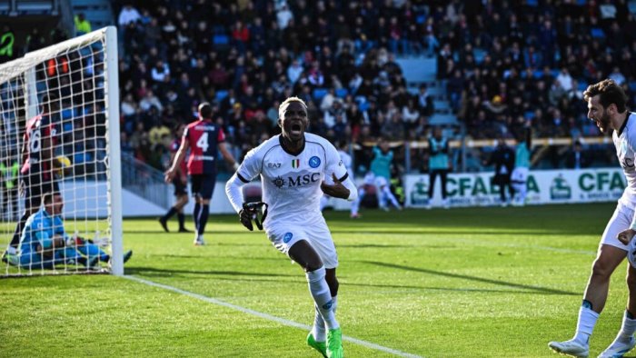 Ennesimo risultato conquistato nel finale dal Cagliari di Claudio Ranieri, che ferma sull'1-1 il Napoli di Francesco Calzona e resta in lotta nelle zone basse della classifica: Al gol di Osimhen nella prima metà del secondo tempo risponde quello di Luvumbo al 96'. Partita molto fisica nei primi quindici minuti di gioco, con diversi duelli in mezzo al campo ed entrambe le squadre che trovano difficoltà nel costruire le loro trame offensive. Alle iniziative del Cagliari, specialmente da sinistra, prova a rispondere il Napoli, che alla mezz'ora si accende con la soluzione tentata da Raspadori, rapido a convergere sulla trequarti e calciare dalla distanza trovando la parata di Scuffet. Risale il campo la formazione rossoblù e sulla punizione battuta da Gaetano troverebbe il gol del vantaggio grazie all'autorete di Rrhamani: tutto fermo però dopo il controllo del Var, che ravvisa la posizione di fuorigioco di Lapadula e la giudica impattante ai fini della giocata del difensore azzurro, annullando dunque il gol al Cagliari. Si resta sullo 0-0 fino all'intervallo, con l'indirizzo del match che sembra non cambiare nemmeno in avvio dei secondi quarantacinque minuti.