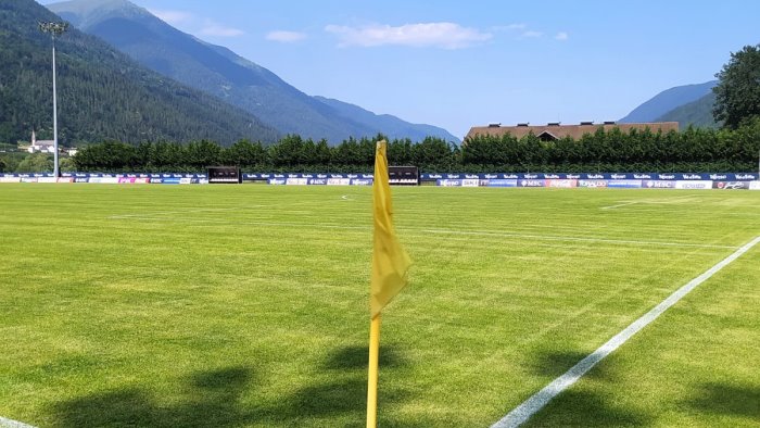Totalmente agibile è la nuova tribunetta Sud dotata di una copertura che richiama vagamente i tetti delle baite alpine. Un bel colpo d’occhio in direzione delle Dolomiti di Brenta. Ultimi ritocchi anche alla nuovissima palestra ricavata a filo del campo di gioco sotto il nuovissimo edificio destinato ad ospitare le scuole elementari di Dimaro Folgarida. Ieri è stato posato il pavimento in materiale gommoso e oggi si è conclusa la posa della moquette di colore azzurro che fa da contraltare alle pareti tinteggiate di bianco immacolato. Uno dei lati lunghi della palestra è caratterizzato da una serie di grandi finestroni che consentono di gettare lo sguardo sul terreno di gioco. Sembra quasi una di quelle aree VIP che caratterizzano i grandi stadi. A bordo campo sono stati posizionati i grandi gazebo che ospiteranno sia gli ospiti del ritiro e sia chi è impegnato nelle varie mansioni del Comitato organizzatore. In corso gli ultimi ritocchi grazie alla squadra del Comune capitanata da Alessandro Largaiolli.