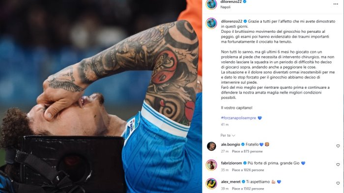La vera rivelazione del post affidato ai social riguarda però un problema che Di Lorenzo si trascinava da tempo. Il capitano ha confessato di aver giocato gli ultimi sei mesi con un serio infortunio al piede.
