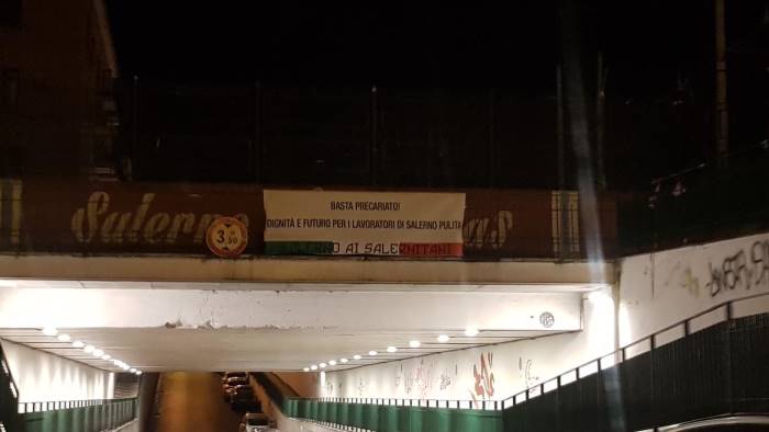 Il Sindacato Sinlai e Forza Nuova Campania, tramite uno striscione, hanno voluto esprime la propria solidarietà ai lavoratori di Salerno Pulita che vedono il loro futuro lavorativo in pericolo. Ciro Picariello, responsabile salernitano di Forza Nuova ha spiegato i motivi dell'azione.