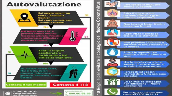 Un decalogo per fronteggiare la situazione Coronavirus ed evitare allarmismi. A realizzarlo è stato l'Ordine dei Medici di Salerno che, questa mattina, ha tenuto un incontro per fare il punto della situazione e tracciare le linee guida da seguire in questa fase. “Tali indicazioni sono perfettamente conformi alle prescrizioni delle autorità sanitarie, del Governo e della Regione Campania. Si confida nella massima collaborazione di tutta la popolazione. Massima vigilanza, niente allarmismi. Diffidate delle fake news e seguite solo ed esclusivamente le comunicazioni ufficiali”, l'appello del sindaco di Salerno, Enzo Napoli che ha partecipato all'incontro.