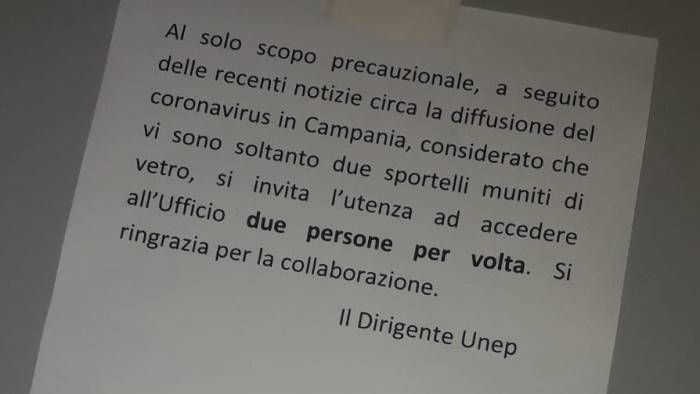"Al solo scopo precauzionale, a seguito delle recenti notizie circa la diffusione del coronavirus in Campania, considerato che vi sono soltanto due sportelli muniti di vetro, si invita l'utenza ad accedere all'ufficio due persone per volta". Questa la circolare a firma del dirigente dell'Unep, la sede degli uffici giudiziari di Salerno.