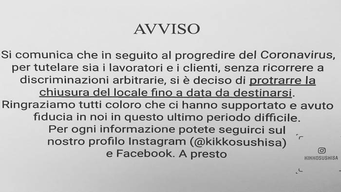 "Avviso: Si comunica che in seguito al progredire del Coronavirus, per tutelare sia i lavoratori e i clienti, senza ricorrere a discriminazioni arbitrarie, si è deciso di protrarre la chiusura del locale fino a data da destinarsi. Ringraziamo tutti coloro che ci hanno supportato e avuto fiducia in noi in questo ultimo periodo difficile. A presto"