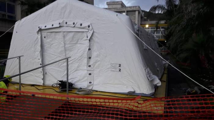 Sono state montante dai volontari del coordinamento di Protezione Civile rete Campani la tensostruttura al di fuori dell'oespedale Ruggi D'Aragona di Salerno. La tenda pneumatica, dotata di impianto elettrico e di illuminazione interna, consentirà alla struttura sanitaria di avere uno spazio attrezzato per attività di pre-triage per fronteggiare l’emergenza Covid-19.
