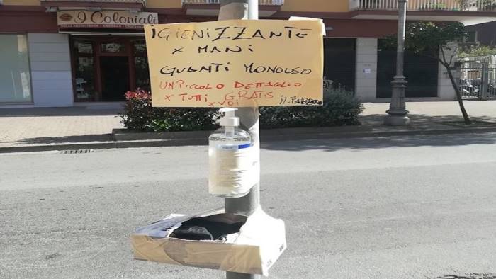 Solidarietà e altruismo, sono questi i principi alla base del bel gesto di un fabbro di Salerno. Un giovane che, nel quartiere di Torrione, armato di scotch ed un semplice cartoncino, ha attaccato ad un palo nei pressi della sua attività una confezione di guanti monouso e un erogatore di gel igienizzante. Nel pieno dell’emergenza sanitaria, mentre i pazienti positivi al coronavirus aumentano e c’è carenza di dispositivi di protezione individuale (DPI), con la caccia all'ultima mascherina e le “ricette” sul disinfettante fai da te più efficace, il giovane titolare dell’attività situata in via Posidonia ha messo a disposizione di tutti, gratuitamente, guanti e disinfettante, con la speranza che anche altre attività decidano di fare lo stesso. “Un piccolo dettaglio per tutti voi, gratis” ha scritto sul cartello, ricordando come a volte i piccoli gesti facciano la differenza.
