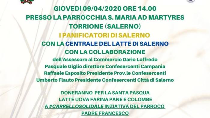 Oggi pomeriggio sarà realizzata un’iniziativa solidale promossa dai Panificatori di Salerno in collaborazione con la Confesercenti Provinciale di Salerno, l’Assessorato alle Attività Produttive del Comune di Salerno, la Centrale del Latte di Salerno, la Parrocchia Santa Maria ad Martyres per donare ai “Carrelli solidali”, nati per volontà del Parroco Padre Francesco, sempre attento alle dinamiche socio economiche del capoluogo salernitano.