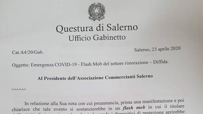 Il Questore di Salerno invita commercianti e ristoratori ad evitare assembramenti in occasione della manifestazione di protesta “Risorgiamo Italia” che si svolgerà in tutta Italia il 28 e 29 aprile. Con una diffida inviata all'associazione Commercianti Salerno, Maurizio Ficarra ha chiesto esplicitamente di ridimensionare l'evento, attenendosi in modo scrupoloso alle norme anti-Covid. In particolare il Questore ha invitato a non collocare all'esterno tavoli imbanditi e a fare in modo che la consegna delle chiavi avvenga in modo virtuale, al fine di evitare un via vai verso il Municipio. L'iniziativa, infatti, prevedeva che la sera del 28 aprile si illuminassero tutti i locali e il giorno seguente si consegnassero in Comune le chiavi delle attività. La protesta, in ogni caso, resta confermata dagli organizzatori che svolgeranno il tutto all'interno dei locali, senza violare le norme anti-Covid. Oltre 350 i ristoratori salernitani che hanno risposto all'invito lanciato dall'associazione Commercianti per Salerno.