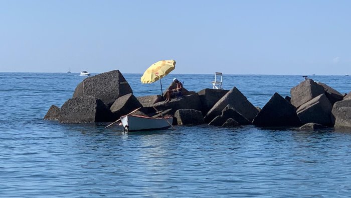 Non è certo se la sosta sui frangiflutti cittadini sia consentita o meno. Quel che è sicuro è che l'estate ai tempi del Covid è sicuramente diversa e particolare. L'immagine che si è presentata all'orizzonte non ha lasciato indifferenti i tanti passanti e turisti che passeggiavano sul lungomare cittadino che hanno immortalato il bagnante tra sorrisi e stupore, condividendo lo scatto.