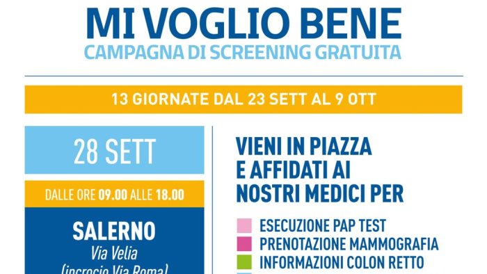 L'ottimo riscontro in termini di partecipazione avuto nella tappa iniziale del tour, del 23 settembre scorso, ha indotto la Direzione Generale dell'Asl Salerno ad organizzare una seconda tappa del tour presso il capoluogo. Pertanto lunedì 28 settembre prossimo il camper della campagna "Mi voglio Bene", con i suoi operatori, sosterà di nuovo a Salerno, in via Velia/incrocio Via Roma dalle ore 9.00 alle ore 18.00.
