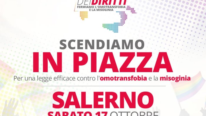 Il Comitato Arcigay Salerno aderisce alla mobilitazione nazionale a sostegno della legge contro l’omofobia e la misoginia. "Saremo in Piazza Sant’Agostino nel pomeriggio di sabato 17 ottobre alle ore 17,30 - annuncia il Comitato - per un momento di sensibilizzazione, confronto e visibilità per ribadire l’urgenza di una legge efficace che contrasti con pratiche di promozione e con strumenti efficaci, non solo di ordine repressivo, il dilagare della violenza a sfondo omotransfobico e contro le donne. Facciamo appello a tutte e tutti affinchè anche da Salerno si alzi un coro a sostegno di un percorso di estensione dei diritti e delle tutele per tutte e tutti".
