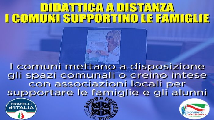 Alle dichiarazioni del responsabile provinciale di As, seguono quelle di Domenico Masullo, presidente provinciale di Gioventù Nazionale Salerno: “In un momento così delicato è opportuno che i comuni si adoperino e mettano a disposizione le strutture comunali per dare la possibilità alle famiglie e gli alunni che necessitano di aiuto per la d.a.d. Comuni e associazioni hanno il dovere di superare un eventuale gap che si potrebbe creare. Il diritto allo studio deve essere uguale per tutti”.