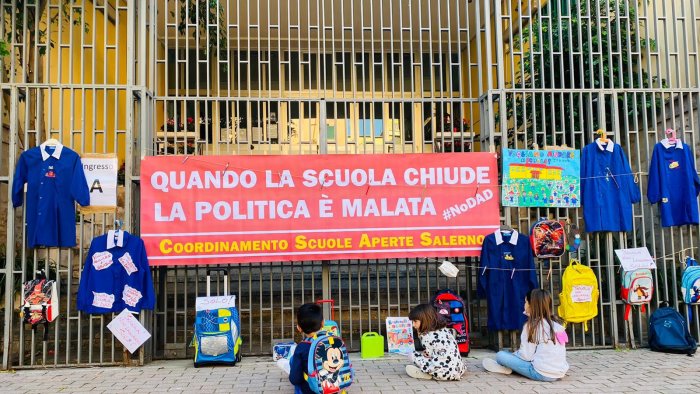 "Quando la scuola chiude la politica è malata", la denuncia a chiare lettere a firma del Coordinamento Scuole Aperte è stata affissa sui cancelli chiusi di diversi istitituti di Salerno. A completare la protesta, grembiuli, zaini e quaderni portati dai bambini. Il gruppo dice no alla didattica a distanza e per farlo ha deciso di scrivere all'assessore all'istruzione della regione Campania, Lucia Fortini e lanciare il presidio a staffetta davanti agli istituti scolastici.
