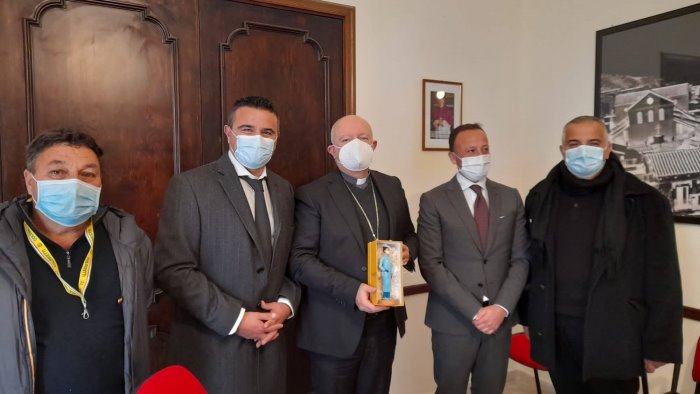 Coldiretti Salerno e Confartigianato hanno consegnato questa mattina al vescovo di Salerno monsignor Andrea Bellandi la statuina del presepe che raffigura l’infermiera anti-Covid prendendo parte all’iniziativa nazionale che promuove la consegna del personaggio simbolo dell'anno in tutte le diocesi Italiane.