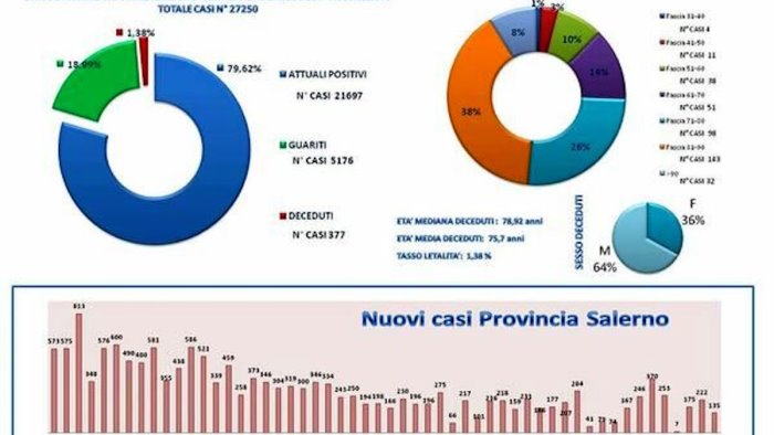 L'Asl di Salerno ha reso noto il report settimanale sulla situazione dei contagi da Covid -19 sul territorio, in lieve risalita per la provincia. Su 27.250 contagi totali, ad oggi sono 21.697 quelli ancora presenti. Venti i decessi e 1.400 gli infetti negli ultimi sette giorni, mille invece i nuovi guariti. L'età media delle persone decedute è di 78,92 anni, 64% uomini e 36% donne.