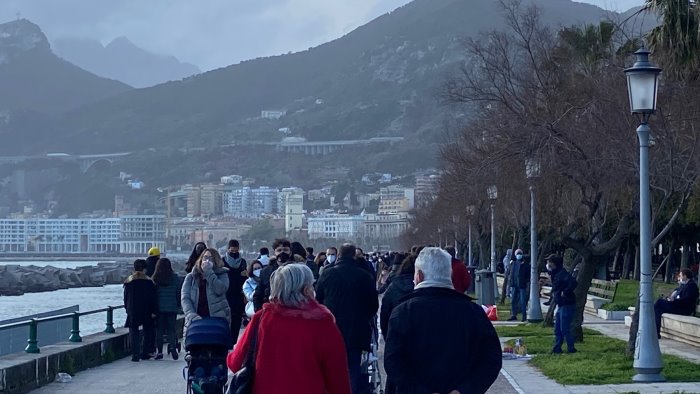 Una bella giornata di sole in zona gialla e con i saldi e Salerno si riempe di visitatori. Folla in città, così come in bar e ristoranti di Lungomare e sul Corso Vittorio Emanuele.