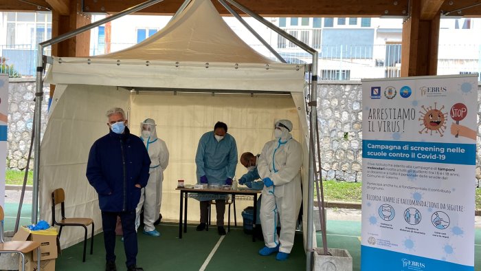 Per quando riguarda le scuole superiori, oltre ad una maggiore popolazione scolastica, ad oggi le stesse sono ancora in presenza al 50%. Gli alunni dovranno quindi tornare per "Non faccio previsioni, non parlo di date: non sono in nostro possesso né le può fornire al momento Ebris". Nel primo giorno di tamponi, "ha aderito quasi la totalità della popolazione scolastica - spiega Avossa - ed i bambini sono tranquilli. Non sono stati riscontrati traumi e controindicazioni. Lo screening serve ad evitare affollamenti e viene svolto non a caso a scuola, negli ambienti familiari ai bambini. Viene effettuato da infermieri e gli alunni sono accompagnati dai docenti". Poi l'appello: "In via lungomare Tafuri, dal lunedì al sabato, dalle ore 15 alle 20, devono recarsi gli alunni che non erano presenti a scuola, nel giorno dedicato ai tamponi. Non devono andare altre persone". Riguardo le scuole superiori di secondo grado, oltre ad una maggiore popolazione scolastica, il vice sindaco sottolinea che molte classi sono in presenza al 50%: "Quindi lo screening non può essere completato. Pensiamo di utilizzare il sabato come giornata alternativa, di copertura."