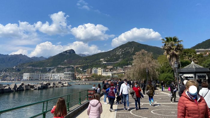 Nonostante la Campania sia, ancora per poche ore, zona rossa, a Salerno prove generali di zona arancione. Anzi, per molti: "prove generali di ritorno alla normalità". Da questa mattina, infatti, complice il sole e la bella giornata, tantissimi cittadini hanno invaso i luoghi del cuore della città "riappropriandosi" di spazi per lungo tempo vietati. Preso d'assalto il lungomare cittadino, affollato da grandi e bambini. Pieni anche i parchi e le spiagge. Nonostante i contagi siano ancora tanti e le normative antiCovid in vigore vietino, tra le altre cose, assembramenti di ogni tipo, tantissimi i salernitani in strada.