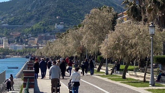 La bella giornata di sole e le temperature miti hanno portato nella città di Salerno un anticipo di zona gialla. Tante le persone in giro, pieni lungomare e Corso Vittorio Emanuele, ma non mancano i controlli delle forze dell'ordine per far rispettare le normative anti covid. In molti hanno voluto fare una passegiata anche per approfittare della riapertura delle attività commerciali dopo settimane di zona rossa. Pieni anche i parcheggi in centro. Intanto molti ristoratori sono al lavoro per preparare le proprie attività alla prossima riapertura del 26 aprile, quando finalmente si potrà tornare ad effettuare il servizio ai tavoli, anche se solo per chi è dotato di uno spazio esterno.