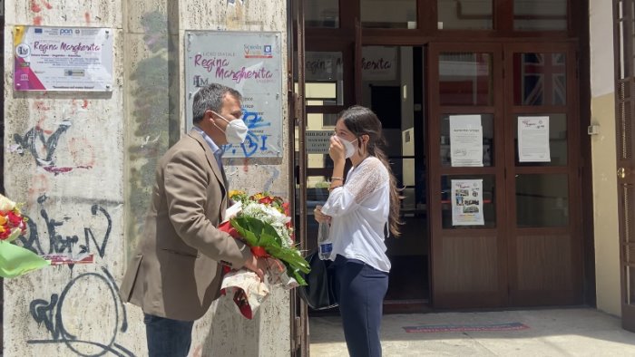 Un mazzo di fiori, un grande sorriso e - seppur con ancora qualche restrizione - un'estate davanti all'insegna dei viaggi. Poco meno di un'ora e il "gioco" è fatto: Nicole esce dal liceo "Regina Margherita" più leggera. Il suo esame di maturità è finito e sebbene la mascherina le nasconda metà viso, la gioia si vede dagli occhi. All’uscita, ad attenderla il papà, e gli amici di sempre. La maturità al tempo del Covid si fa senza "squadra di sostegno": ammesso un solo accompagnatore per ogni candidato all’interno.