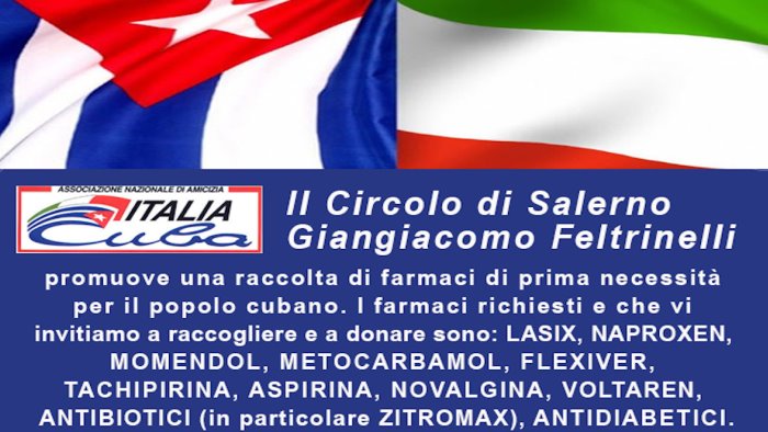 "Aiutiamo il popolo cubano che da oltre 50 anni è costretto all’embargo che rende difficoltoso reperire beni di prima necessità e sanitari." Questo l'obiettivo alla bese dell'iniziativa messa in campo da l’Associazione Nazionale di Amicizia Italia/Cuba, Circolo Giangiacomo Feltrinelli, che promuove una raccolta di farmaci di prima necessità per il popolo cubano.