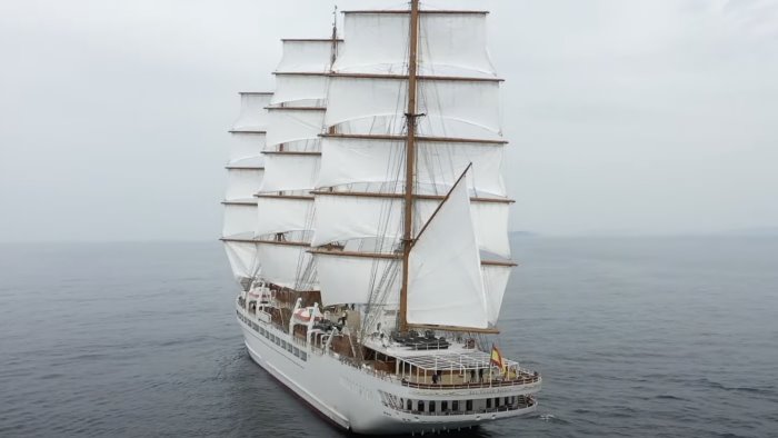 E' la nave da crociera a vela pensata per un numero ridotto di passeggeri: poco più di 100, numeri molto lontani dalle mega navi da crociere che di solito si affacciano negli scali campani.