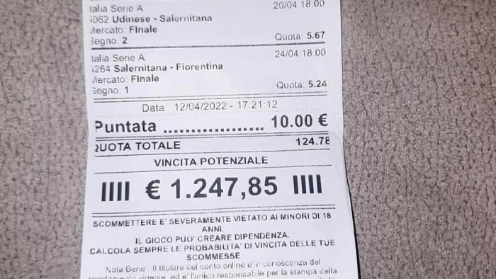 "Un nostro collaboratore Salvatore di Vietri ha avuto molta fede. Ha avuto un giusto premio ed io sono felice", lo scrive sulla sua pagina Facebook l'imprenditore salernitano Salvatore Gagliano, pubblicando la foto di una schedina giocata da un tifoso della Salernitana che aveva scommesso sulle tre vittorie della squadra. Con na puntata di dieci euro ne ha vinti oltre 1200 euro.