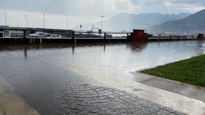 Bomba d'acqua su Salerno nel primo pomeriggio di oggi, intorno alle 15.30, la pioggia improvvisa ha allagato strade e Lungomare. In pochi minuti una grande quantità d'acqua si è abbattuta sulla città.