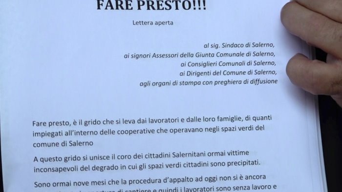 "Fare presto è il grido che si leva dai lavoratori e dalle loro famiglie, di quanti impiegati all'interno delle cooperative che operavano negli spazi verdi del comune di Salerno. A questo grido si unisce il coro dei cittadini, ormai vittime inconsapevoli del degrado in cui gli spazi verdi sono precipitati - si legge nella missiva consegnati alla stampa e fatta recapitare ai consiglieri -. Sono ormai nove mesi che la procedura d'appalto ad oggi non si è ancora concretizzata in apertura di cantiere e quindi i lavoratori sono senza lavoro e senza reddito", l'appello disperato delle maestranze e delle loro famiglie.