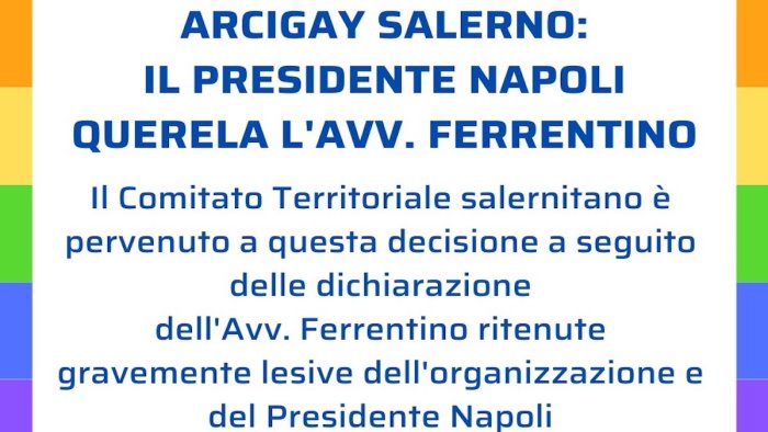 “Dopo alcune settimane di riflessione, ed avendo superato il momento del Salerno Pride, sono pervenuto in accodo con i miei legali, alla decisione di sporgere formale querela nei confronti dell’Avv. Ferrentino a seguito delle sue dichiarazioni comparse su numerose testate locali, regionali e nazionali; dichiarazioni che abbiamo ritenuto fortemente diffamatorie della mia persona e dei contesti professionali ed associativi che rappresento.