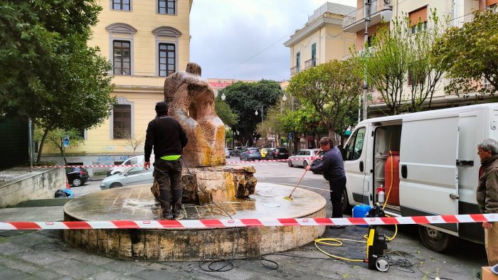 Rinasce la scultura di Piazza San Francesco a Salerno: dopo innumerevoli segnalazioni da parte dei residenti e dei fruitori (a cominciare dal Comitato di quartiere), sono partite questa mattina le operazioni di bonifica e pulizia del monumento.