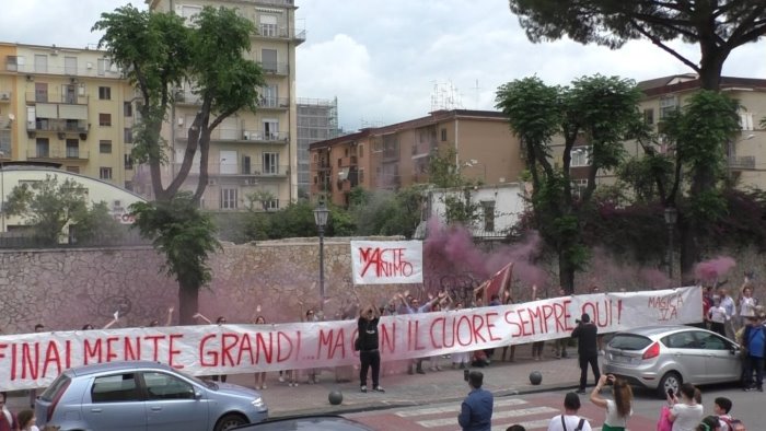 Per qualche minuto, stamane, l'area esterna della scuola “Matteo Mari” di Salerno si è trasformata in una succursale dello stadio Arechi. I genitori degli alunni che frequentano la quinta A, in occasione dell’ultimo giorno di lezioni ed a conclusione del ciclo di studi della scuola primaria, hanno organizzato una sorpresa a studenti e insegnanti. Per salutare la fine dell’anno scolastico e l’inizio di una nuova avventura dei propri bambini, hanno realizzato uno striscione di circa 20 metri ed uno a due aste, salutando con fumogeni e cori da stadio l’uscita da scuola degli alunni e delle maestre. Sullo striscione grande c’era la scritta: “Finalmente grandi... ma con il cuore sempre qui! Magica V A”. Un modo singolare per ringraziare tutto il corpo docente dell’istituto, la dirigente scolastica Mirella Amato, il suo vice Daniele Branca e tutti i collaboratori della scuola.