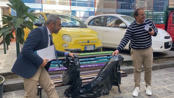 Nel rione Fornelle, invece, già questa mattina sono stati sostituiti i vecchi contenitori della raccolta differenziata con nuovi bidoni appositamente decorati dall’artista GreenPino, veri e propri pezzi unici, che andranno ad integrarsi nel contesto esistente dei Muri d’Autore, diventati negli anni una consolidata attrazione turistica; sono state già rigenerate e decorate con versi poetici le panchine esistenti; sarà installata entro dicembre una panchina smart con accanto una piccola libreria; sarà realizzato, sempre entro dicembre da GreenPino un nuovo murale, utilizzando vetro di bottiglie, che conterrà anche un verso inedito selezionato tra quelli inviati dagli oltre cento partecipanti al concorso nazionale “Messaggi in bottiglia”.