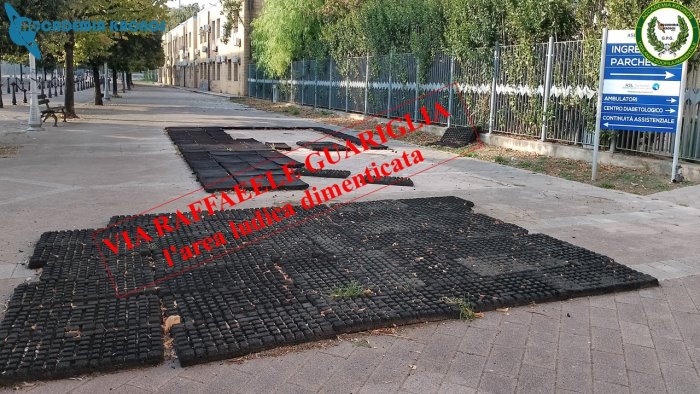 "L'area pari circa a venti/trenta metri quadri, si presenta priva di numerosi tappetini antiurto ed i pochi rimasti sono fortemente usurati e non più agganciati al suolo ma, la situazione più pericolosa è effettivamente costituita dai perni sporgenti che in origine erano destinati al fissaggio dei tappetini", si legge nella nota dell'associazione.