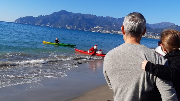Ha incantato soprattutto i più piccoli l'arrivo dal mare di Babbo Natale sulla spiaggia di Mercatello, a Salerno. Un canoista, indossando la tradizionale divisa di Santa Claus, è arrivato sull'arenile cittadino. Tanti curiosi hanno datto a gara per scattare una foto, regalando un sorriso soprattutto ai più piccoli. Ma non è stato l'unico momento di divertimento e svago.