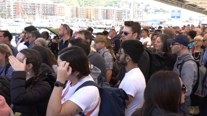 Pienone di turisti a Salerno, complice anche la bella giornata di sole. Lunghe code agli imbarchi per la Costiera Amalfitana al Molo Masuccio, fin dalle prime ore della mattina. Tante le persone che non hanno trovato posto a bordo dei traghetti per le località della Divina e hanno dovuto attendere le corse successive, moltissimi gli stranieri ma anche tanti gruppi di italiani che hanno approfittato del lungo ponte del 25 aprile per un viaggio sul territorio.