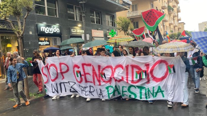 “Palestina libera”. È il grido che si è alzato questo pomeriggio dalle strade di Salerno dove centinaia di persone sono scese in piazza per chiedere lo stop del conflitto a Gaza. L'iniziativa ha visto la partecipazione di associazioni e comitati che hanno aderito a “Unit3 per la Palestina”, la piattaforma che ha unito tutte le realtà culturali e socio politiche di Salerno e provincia. I manifestanti hanno ribadito la necessità di un immediato e permanente cessate il fuoco a Gaza, chiedendo il rispetto del diritto internazionale e umanitario in tutta la Palestina. “Se è possibile violare in maniera così esplicita e arrogante il diritto internazionale – hanno spiegato i manifestanti -. vuol dire che non esiste più, perché o vale per tutti o per nessuno”.