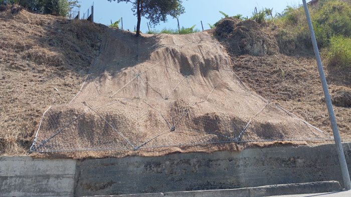 Si tratta di interventi di sistemazione e messa in sicurezza del fronte del pendio a monte della strada consistenti in: pulizia e scotico delle parti superficiali instabili (vegetazione alto fusto e arbusti e parti di terreno di copertura); messa in opera di un sistema geocomposito antierosivo con sovrapposto rafforzamento corticale costituito da una rete in acciaio a doppia torsione.